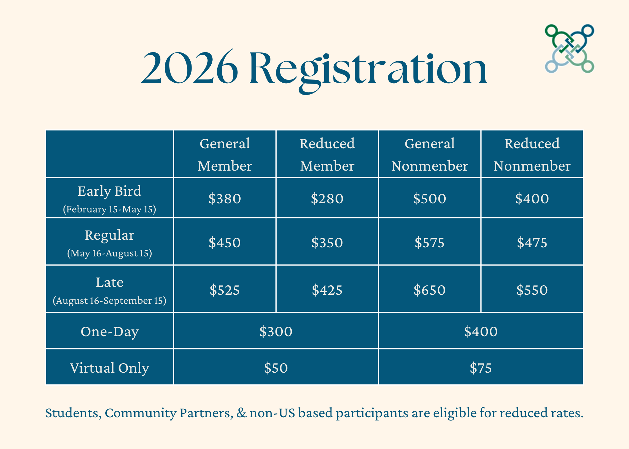 100% refund until August 15, 2026 and 50% refund from August 16-September 15, 2026. No refunds will be issued beginning September 16, 2026. No refunds for no-shows.